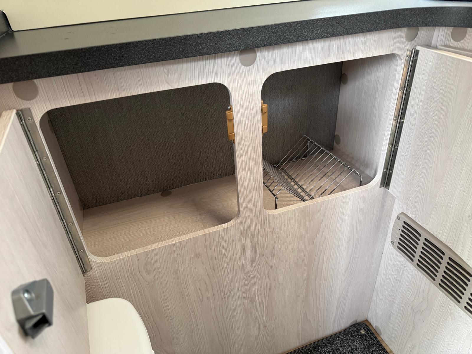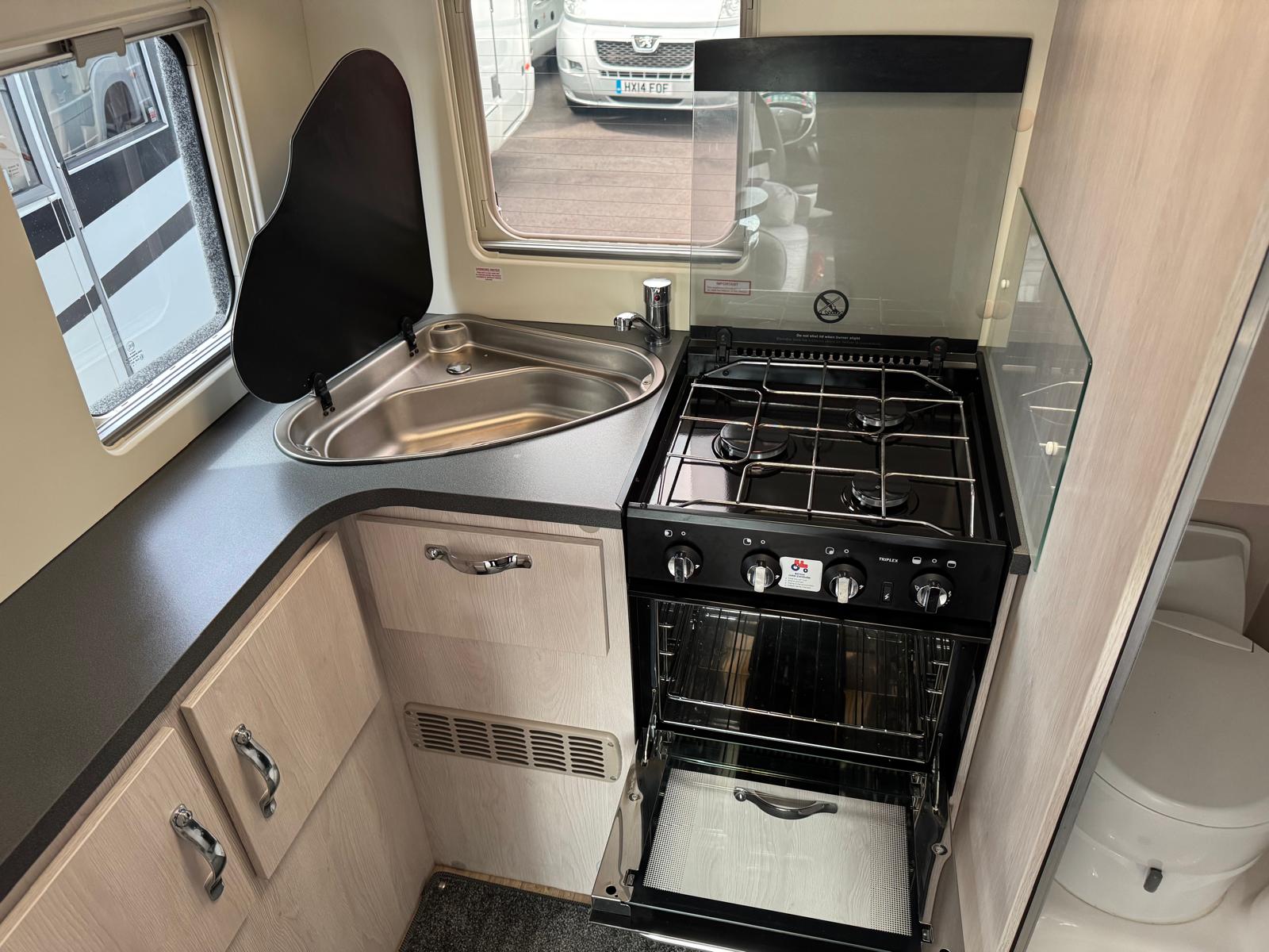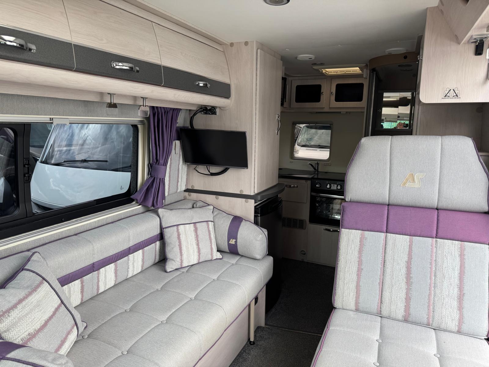 With the front lounge the same as the standard Auto-Sleepers Symbol the Auto-Sleepers Plus is the 5.99m version with an L-shaped kitchen on the offside rear corner. The front lounge can be converted in two single beds or one huge double bed.