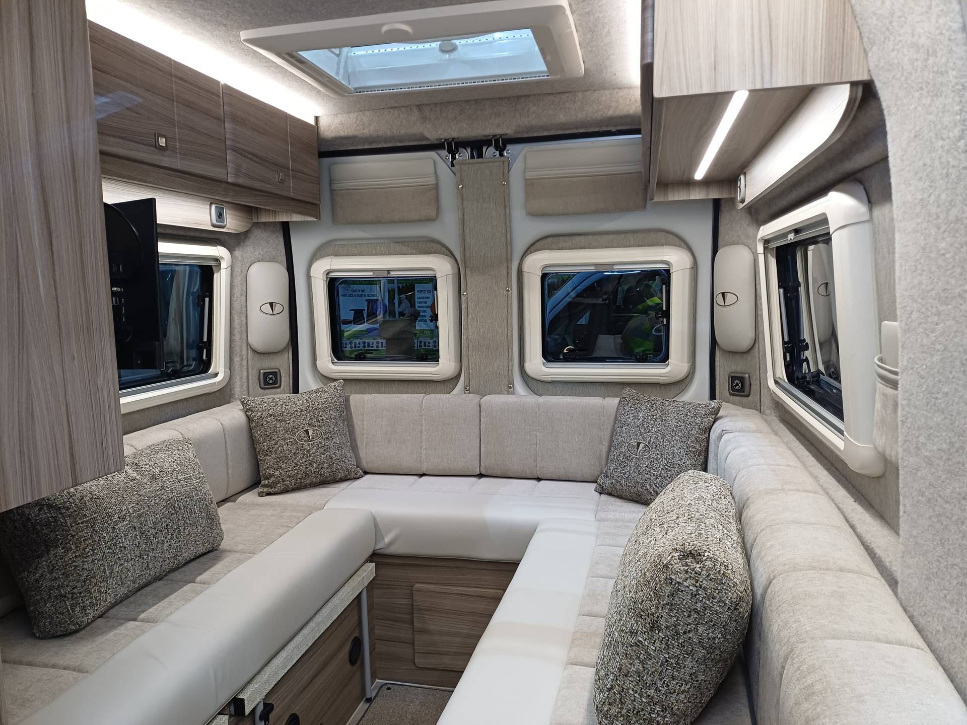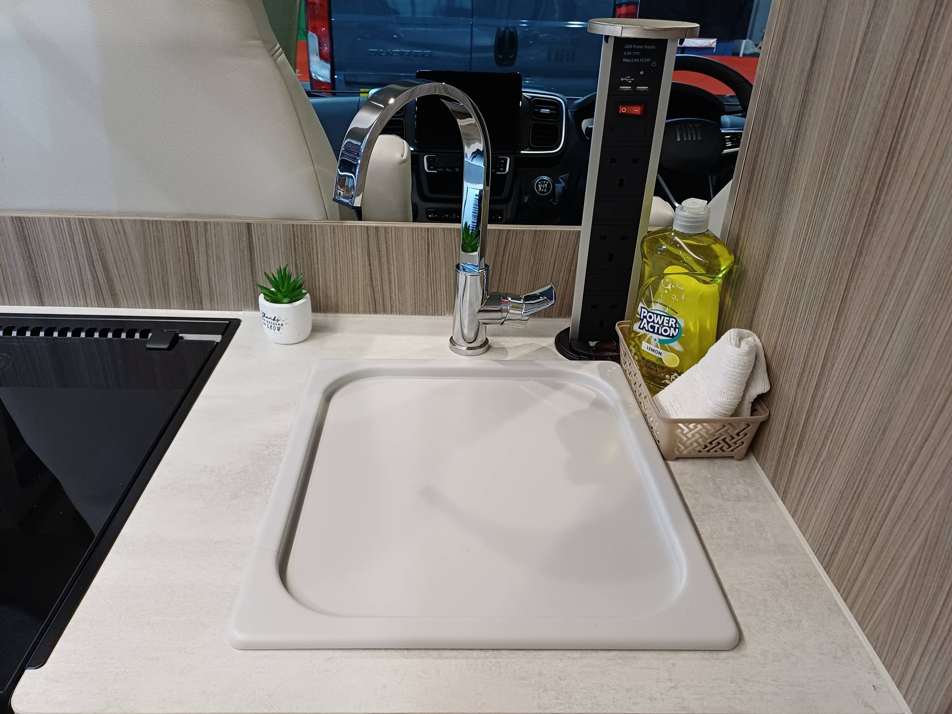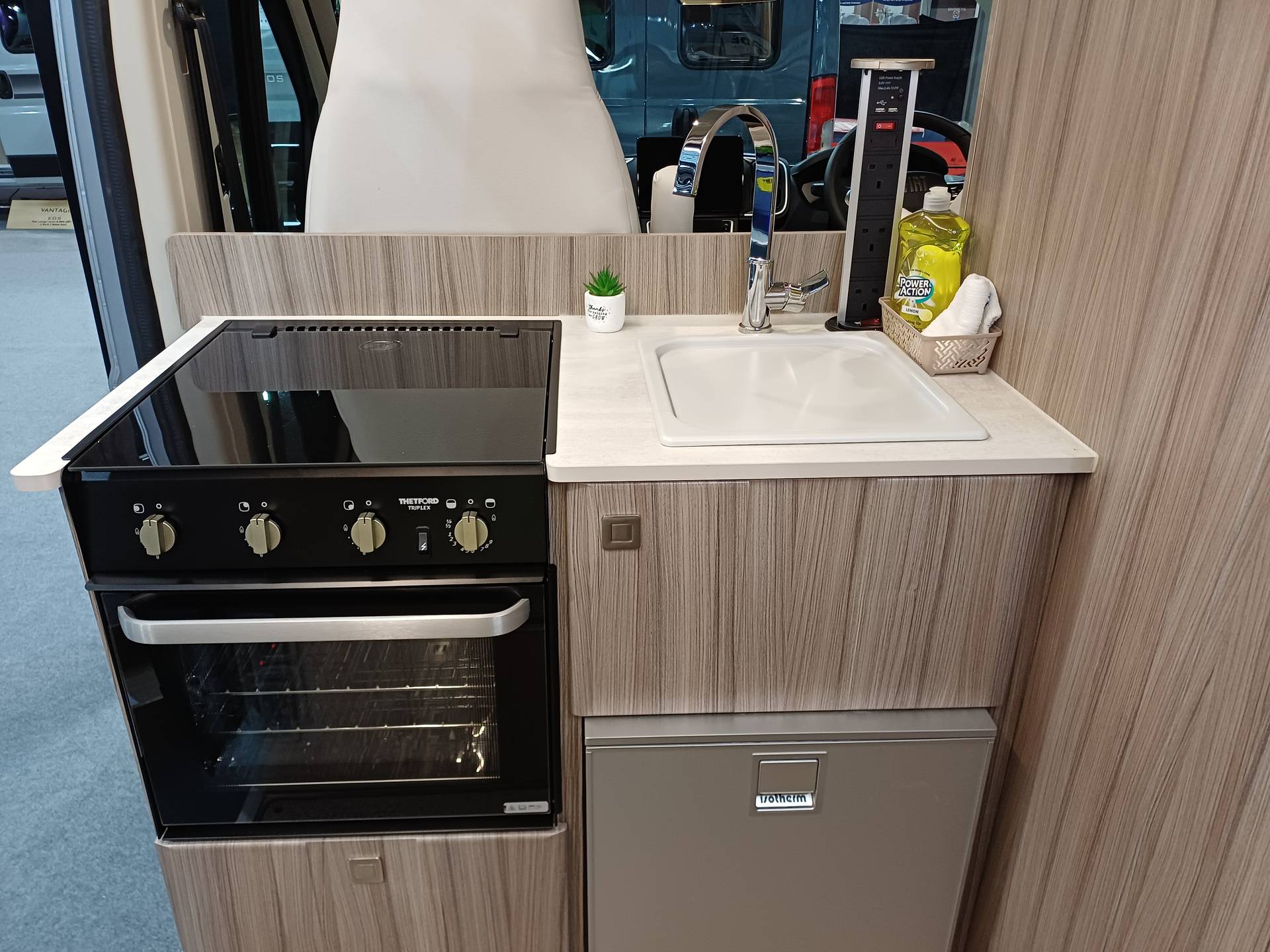 The CUB provides two single beds 6′ 3″ in length or one super king size bed. There is a choice of two tables for the rear lounge area. The kitchen area equipped with a combined gas oven and grill, three burner gas hob, 65 litre 12v compressor fridge freezer, sink and power tower with 3 x 240v sockets. All this in a 5.4m easy to park van.