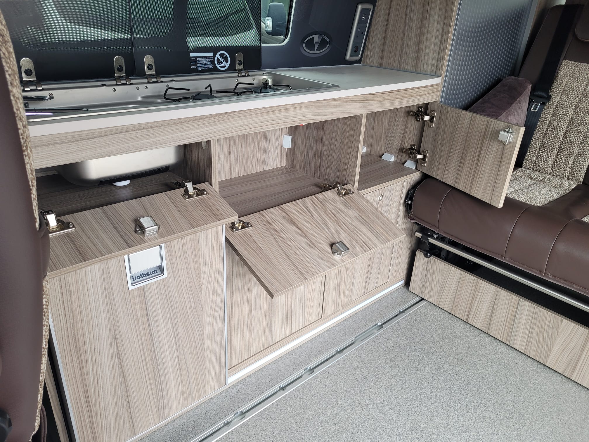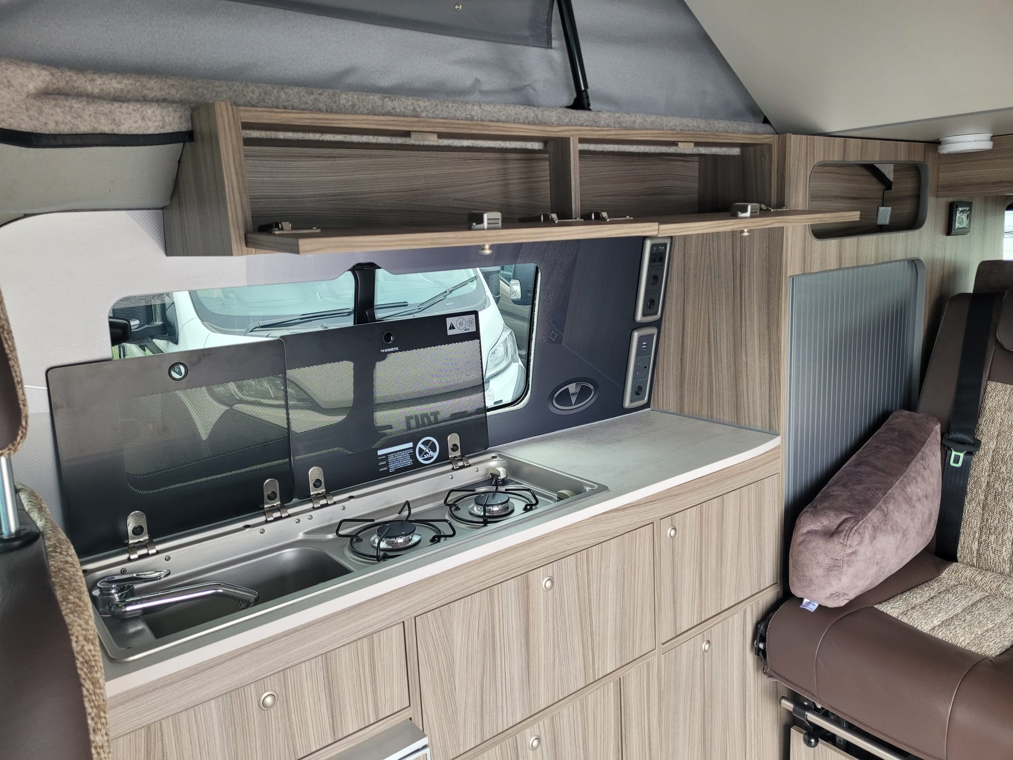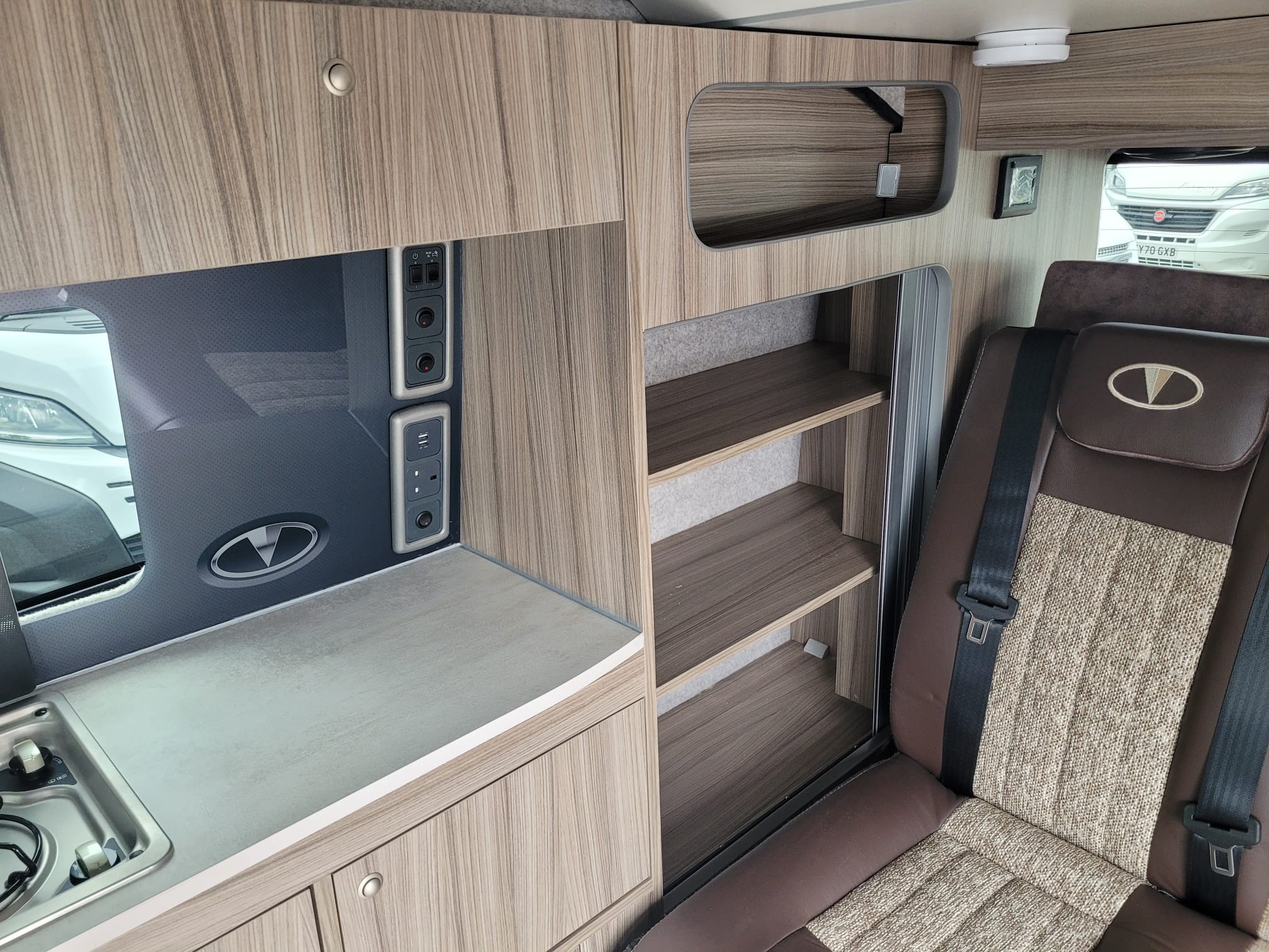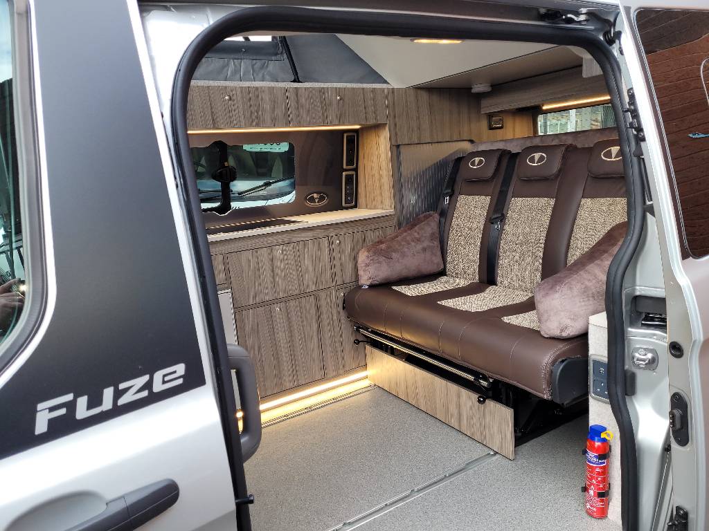 The FUZE was very well received when it debuted at the October 2022 NEC show.  The kitchen is equipped with a two burner hob and sink with split lid, low energy fridge freezer, laminate worktop and splashback and a storage cupboard.  The triple belted rear Reimo V3000 rock n roll seat converts in to a fully flat comfortable large bed and is trimmed in Willow Creek upholstery, with an optional double bed in the elevating roof.  It comes with a 12L fresh water barrel and rear gas locker and a 100ah leisure battery with a 100w solar panel as standard.