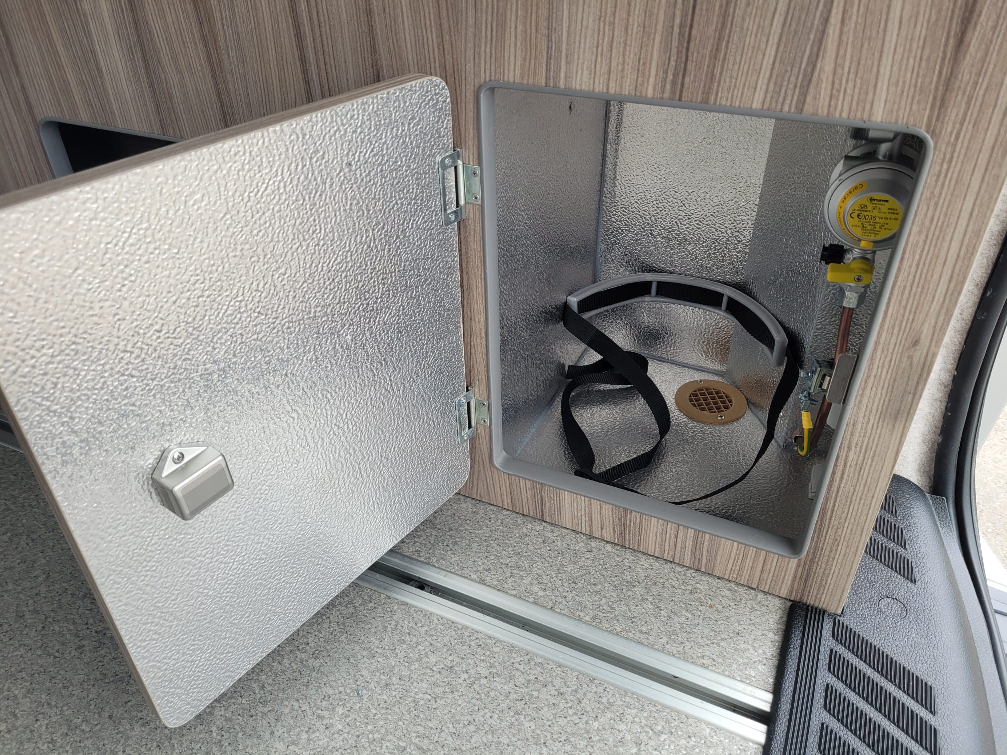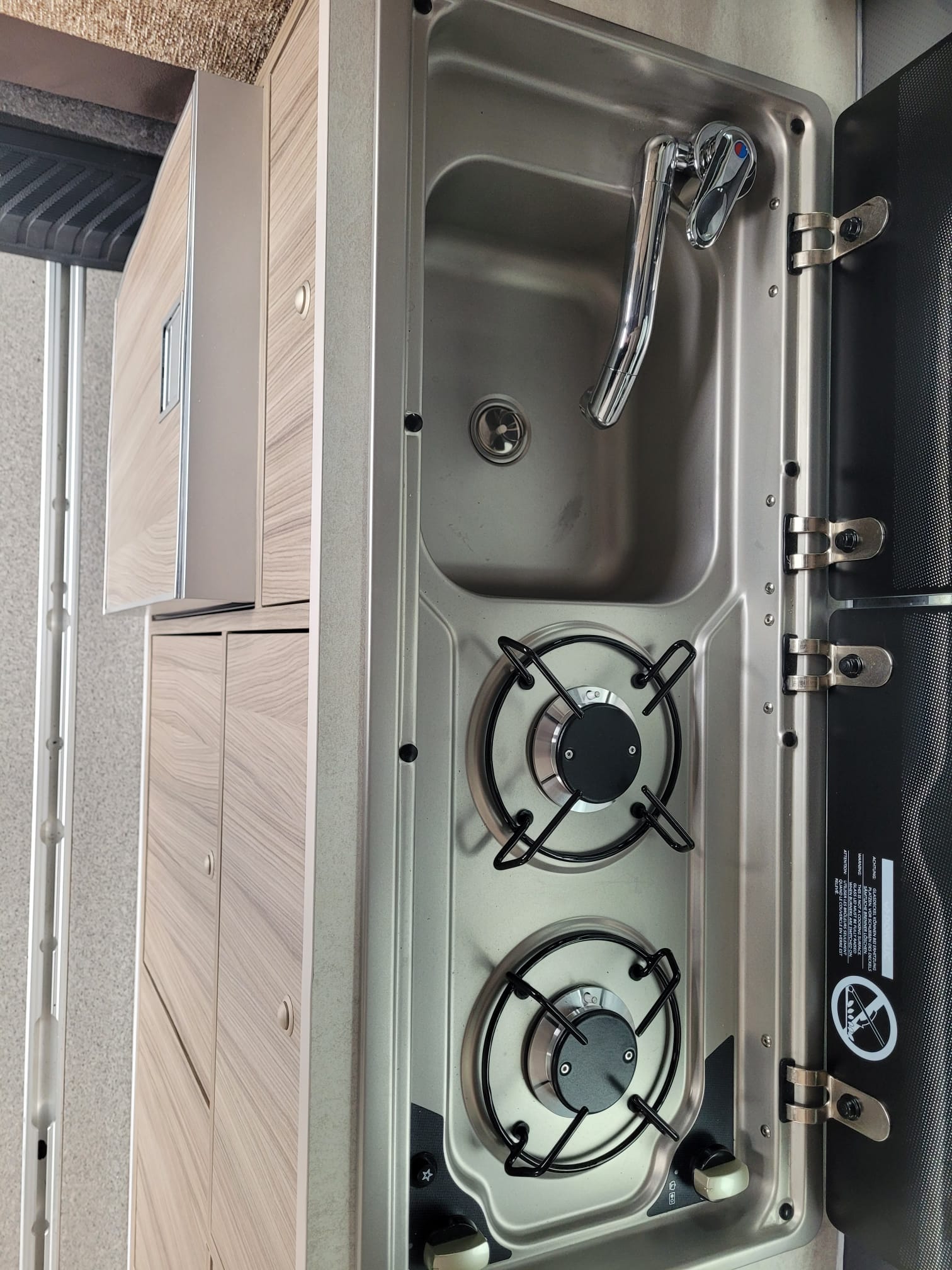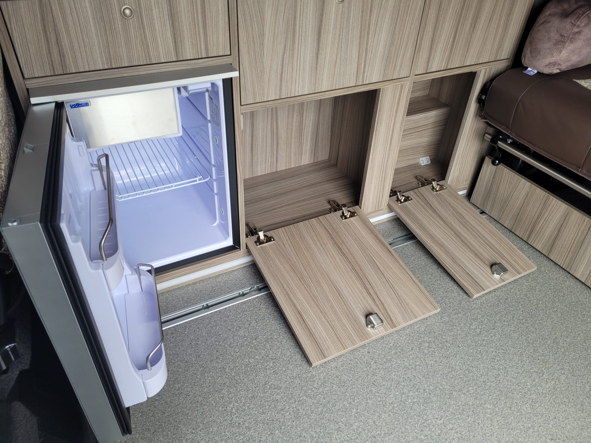 The FUZE was very well received when it debuted at the October 2022 NEC show.  The kitchen is equipped with a two burner hob and sink with split lid, low energy fridge freezer, laminate worktop and splashback and a storage cupboard.  The triple belted rear Reimo V3000 rock n roll seat converts in to a fully flat comfortable large bed and is trimmed in Willow Creek upholstery, with an optional double bed in the elevating roof.  It comes with a 12L fresh water barrel and rear gas locker and a 100ah leisure battery with a 100w solar panel as standard.